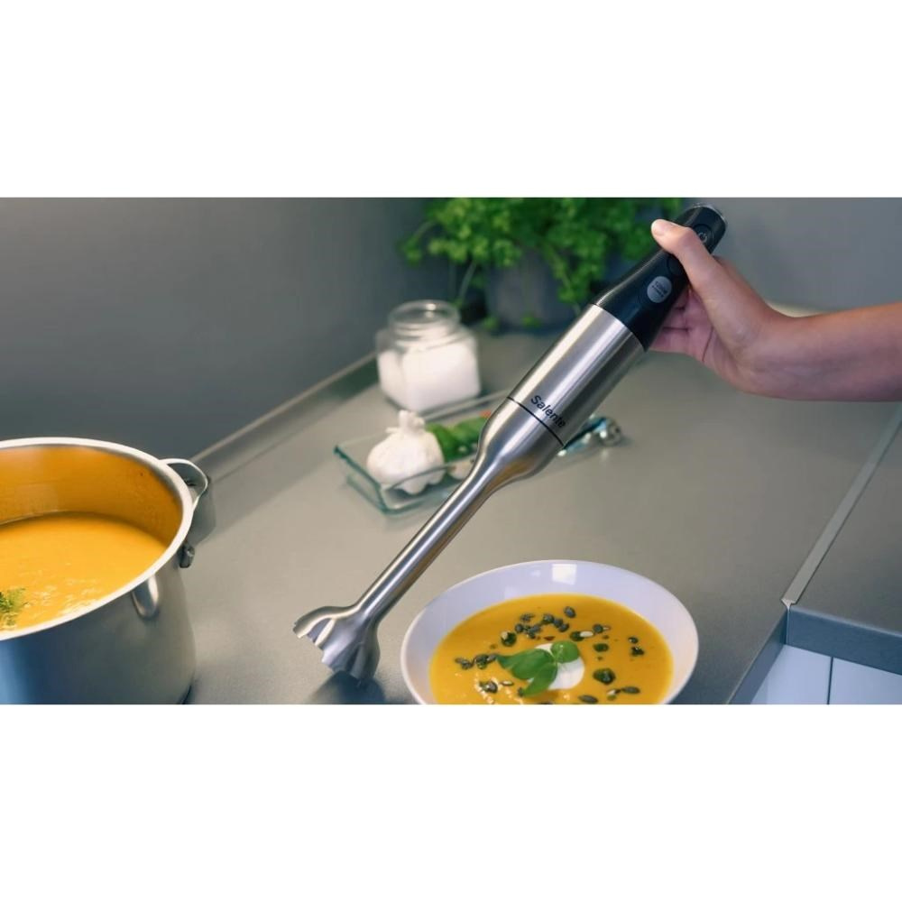 Dôkazom premysleného spracovania mixéru Salente Mixxo je aj funkcia AntiSplit, ktorá zabraňuje priľnutiu mixovacej hlavy ku dnu nádoby. Eliminuje tak rozstreky mixovaných surovín, takže môžete pracovať s maximálnym pokojom, pretože sa nemusíte obávať neporiadku okolo. Nerezová mixovacia noha navyše bez problémov zvládne aj horúce a vriace jedlá, a tak nie ste obmedzení ani pri príprave náročnejších delikát.
