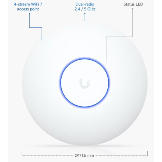 Popis produktu Ubiquiti U7-Lite je cenově nejdostupnější WiFi 7 UniFi AP. Jedná se o dual-band access point s rychlostí přenosu až 4,3Gbps v 5GHz pásmu a až 688 Mbps v pásmu 2,4GHz a pokročilým šifrováním WPA3. U7-Lite je určeno k WiFi pokrytí vaší domácnosti, kanceláře, hotelových prostor nebo skladu. Plná podpora roamingu zajišťuje plynulé předávání připojených klientů mezi jednotlivými AP. Pro připojení do sítě je AP vybaveno 2.5G ETH portem, který slouží i pro napájení pomocí PoE 802.3af nebo pasivním PoE v rozsahu 42,5-57V DC, PoE injektor není součástí balení. Výhody UniFi řešení • Roaming - přechod mezi jednotlivými AP bez výpadků • Wireless uplink – ideální pro místa, kam nelze přivést datový kabel • Až 8 SSID • Detailní statistiky provozu • Guest síť • Load balancing - udržování rovnoměné zátěže / přepínání klientů • Omezování rychlosti pro každé SSID Obsah balení • Zařízení • Kit k přichycení na strop • Sada šroubků Technické parametry Bezdrátové vlastnosti Bezdrátové frekvence:2.4 + 5 GHz (dual band) WiFi standardy:802.11n, 802.11a, 802.11ac, 802.11b/g, 802.11ax, 802.11be MU-MIMO:Ano Přenosová rychlost - 5GHz [Mb/s]:4300 Přenosová rychlost - 2.4GHz [Mb/s]:688 Vysílací výkon 2.4GHz [dBm]:23 Vysílací výkon 5GHz [dBm]:24 Šifrování:WPA, WPA2, WPA3 2.4GHz MIMO:2 x 2 5GHz MIMO:2 x 2 Typ antény:Vestavěná Roaming:Ano Zisk antény [dBi]:4, 5 Konektory a rozhraní Rychlost LAN:(1) 100/1000/2500Mbps Gigabit LAN:Ano Napájení Napájení přes PoE:802.3af, 42 .. 57V DC Typy PoE:PoE-In (pouze) Max. spotřeba energie [W]:13 Fyzické charakteristiky Použití:Vnitřní Tlačítka:Reset Provozní teplota [°C]:-30 až 40 Hmotnost [g]:313 Šířka [mm]:172 Výška [mm]:172 Hloubka [mm]:33 Software Operační mód:Access Point.