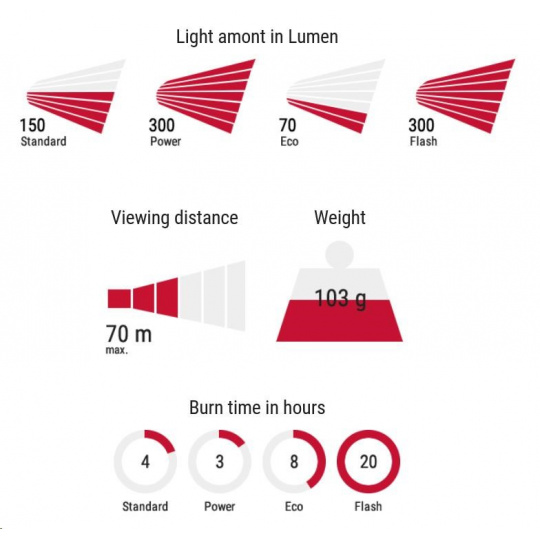 4 svetelné režimy: intenzívny 300 lm / štandardný 150 lm / ekonomický 70 lm / blikajúci