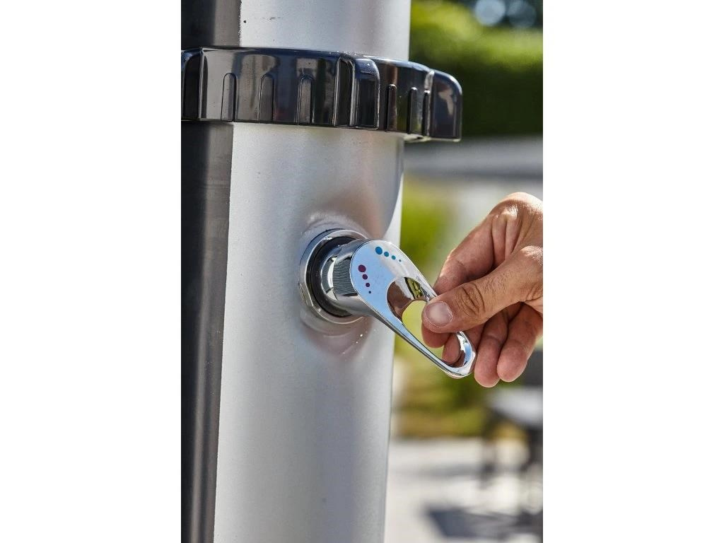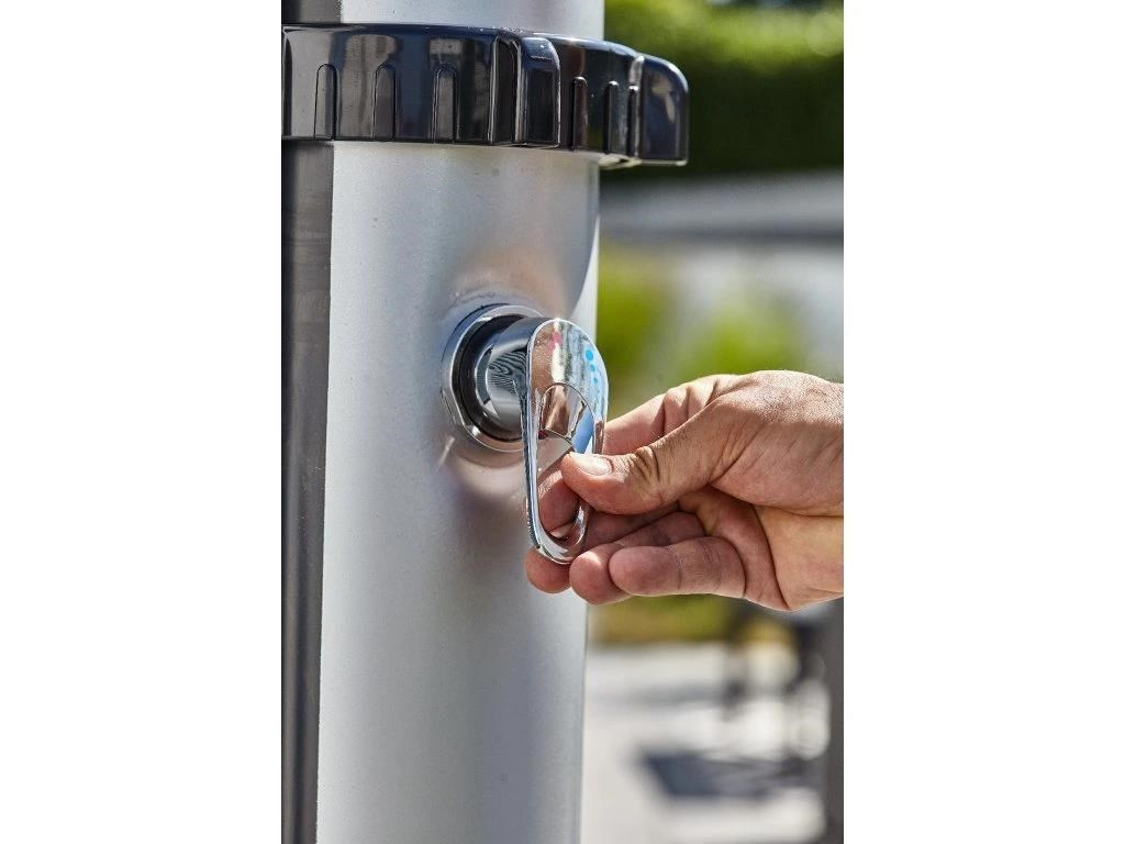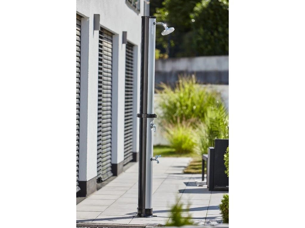 Rodinami obľúbená solárna sprcha s XXL zásobníkom o objeme 40 l a veľkým sprchovacím hlavicou, ktorá zabezpečuje príjemné sprchovanie pripomínajúce ľahký letný lejak. Sprcha je vyrobená z kvalitného PVC odolného voči UV žiareniu. Elegantný vzhľad sprchy podčiarkuje čelná časť imitujúca nerez. Sprcha je vysoká 220 cm a je vybavená praktickým kohútikom na oplach nôh. Pripojenie na prívod vody je veľmi jednoduché pomocou hadicovej rýchlospojky (súčasť balenia).