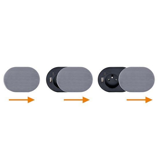 Posuvné viečko chráni zásuvky aj USB porty pred prachom, nečistotami alebo kvapalinami a umožňuje zakryť iba časť, ktorú momentálne nepoužívate. Vrchný kryt z brúseného nerezového ocele v matnej striebornej úprave (inox look) je nielen odolný, ale aj esteticky príjemný, takže zásuvka ľahko zapadne do každého interiéru.