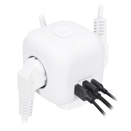 Predlžovací prívod v tvare kocky s dĺžkou strany 8 cm spája tri uzemnené zásuvky s detskou poistkou a USB nabíjačku s portami USB-C a USB-A. Vďaka 2m dlhému káblu poskytuje flexibilné využitie. Protisklzové podložky udržiavajú prívod stabilný na stole alebo pracovnej ploche. Podsvietený vypínač umožňuje jednoduché ovládanie všetkých zásuviek aj USB portov.