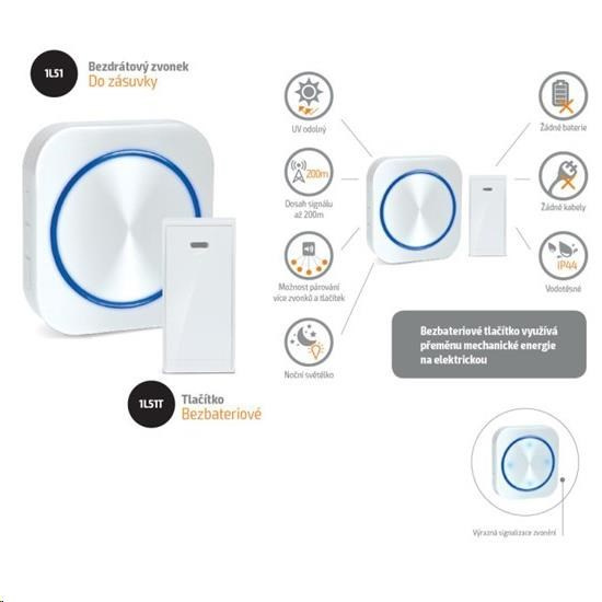 zvonkové tlačidlo na princípe dynama, elektrický signál pre zvonenie je vytvorený prevodom mechanickej energie stlačením tlačidla. Nie je potrebné sa starať o nákladné výmeny batérií, obzvlášť v zimnom období. 4 režimy zvonenia: iba zvonenie, iba blikanie, zvonenie aj blikanie, zvonenie a nepretržité svietenie. Režim nepretržitého svietenia slúži aj ako nočné svetlo. veľká svetelná signalizácia, vhodné do hlukového prostredia alebo pre osoby so sluchovým postihnutím funkcia „Learning code“ umožňuje spárovať viac zvončekov alebo tlačidiel do jednej skupiny 58 voliteľných melódií pamäť nastavení aj pri vytiahnutí zo zásuvky alebo výpadku elektrickej energie LED indikátor zvonenia na zvonku aj tlačidle tlačidlo s krytom na menovku vodotesná ochrana tlačidla IP44 nastavenie hlasitosti zvončeka - 4 stupne (25 - 85dB) uchytenie tlačidla pomocou samolepiacej podložky alebo montážnych otvorov dosah signálu na otvorenom priestranstve: 150m prenášaacia frekvencia: 433MHz napájanie: tlačidlo: bez batérií, životnosť 200 000 stlačení zvono: AC 230V - do zásuvky pracovná teplota: zvonček -10°C až +40°C, tlačidlo bez obmedzení spotreba energie: prijímač (zvonček) v pohotovostnom režime: <0,5W farba: biela náhradné tlačidlo Solight č. 1L51T k jednému zvonku môžu byť spárované max. 6 tlačidiel jedno tlačidlo môže byť spárované s max. 6 zvonkami