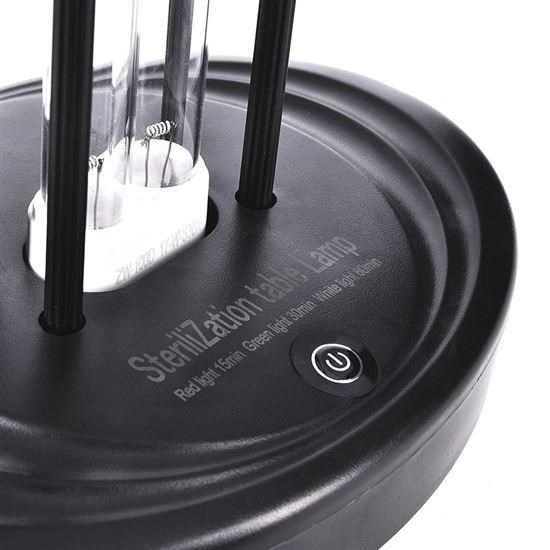 prenosná stolná lampa na dezinfekciu domácností, kancelárií, škôl, chôdieb, atď dezinfikuje vplyvom UV-C žiarenia a plynu O3 (ozón) inteligentný senzor, v prípade prítomnosti ľudí pri dezinfekcii sa lampa sama vypne, následne sa opäť zapne veľmi bezpečný a vysoko účinný spôsob dezinfekcie neznečisťuje životné prostredie ani odpadové hospodárstvo použitými chemickými prípravkami je až 3000x rýchlejšie ako dezinfekcia chlórom a 25x efektívnejšie ako chloritová kyselina likviduje vírusy, plesne, baktérie, huby, hmyz. dezinfikovaná plocha: až 80m2 časovač 15/30/60min doporučená doba dezinfekcie (časy sú iba orientačné): miestnosť 40m2 - 15min miestnosť 50m2 - 30min miestnosť 80m2 - 60min vlnová dĺžka 185nm, farba svetla: modrofialová ozón a UV-C žiarenie sú zdraviu nebezpečné, pozorne čítajte návod na použitie odporúčaný interval pre dezinfekciu: 1 - 3x týždenne životnosť žiariča: až 5000 hodín dosah diaľkového ovládača: 20m materiál: kremíková trubica + ABS výkon žiariča: 100W napätie 230V/50Hz, dĺžka prívodného kábla 1,2m batéria diaľkového ovládača: 1x CR2025 rozmery: 200x550mm hmotnosť: 1,3 kg farba: čierna