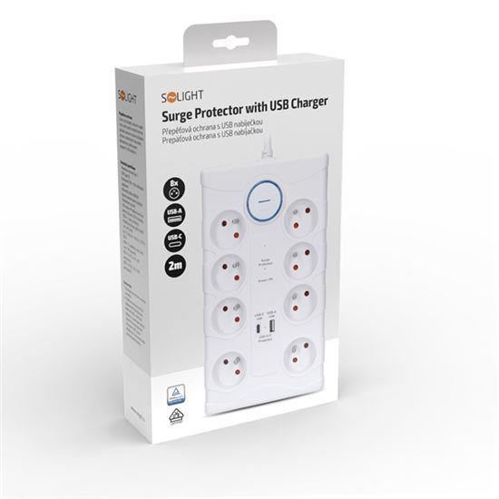 Solight přepěťová ochrana, 8z, USB A+C, 2m, bílá