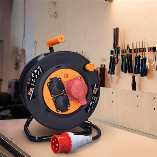 Odolný predlžovací prívod na bubon s dĺžkou 25 m, s jednou zásuvkou na 400 V a dvoma zásuvkami na 230 V je ideálnou voľbou na napájanie stavebných strojov, profesionálneho náradia alebo dielenského vybavenia. Vďaka káblu z mäkčenej gumy a krytiu IP44 je vhodný aj do náročných podmienok na stavbách alebo v priemysle. Samovoľnému navíjaniu bráni integrovaná aretačná brzda.