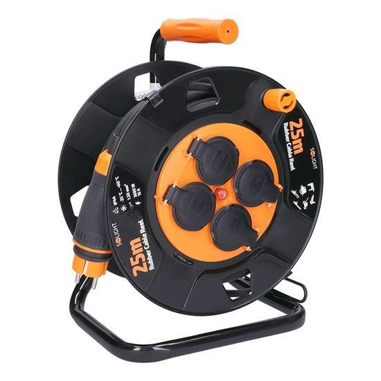 Solight prodlužovací přívod na bubnu, 4 zásuvky, venkovní, 25m gumový kabel, 3x 1,5mm2, IP44