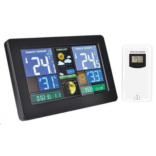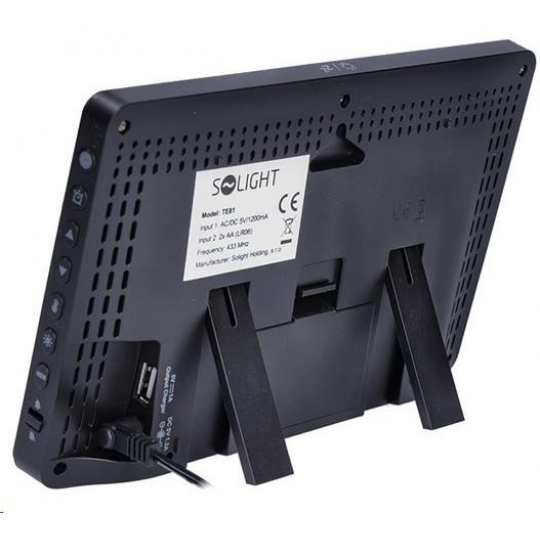 meranie vnútorné teploty: 0°C až +50°C meranie vonkajšej teploty: -20°C až +60°C meranie vnútorných a vonkajších vlhkostí: 20% - 95% meranie atmosférického tlaku: 600 hPa/mb - 1100 hPa/mb USB nabíjací adaptér DC 5V/1000mA upozornenie na dosiahnutie nastavené vonkajšej teploty pamäť minimálnych a maximálnych dosiahnutých hodnôt teploty a vlhkosti, vonkajšej aj vnútorné možnosť pripojenia až 3 bezdrôtových senzorov, funkcia cyklického prepínania medzi jednotlivými senzormi 1 bezdrôtový senzor (súčasť balenia), dosah 60 m vo voľnom priestore predpoveď počasia v 6 grafických úrovniach s indikátorom vývoja ukazovatele stavu batérie pre meteostanicu aj bezdrôtový senzor ukazovateľ úrovne komfortu čas riadený rádiovým signálom, kalendár, fázy Mesiaca budík s intervalom, odloženie budenia 5 min indikátor vývoja teploty, tlaku a vlhkosti farebný podsvietený displej 7.5" (17,0 x 9,4cm) úsporný režim displeja, 5 úrovní podsvietenia displeja, rozsvietenie displeja a odloženie budíka pomocou dotykového senzora na hornej hrane meteostanice. rýchly a komfortný prístup k ovládacím tlačidlám na bočnej hrane meteostanice otvor pre uchytenie na stenu, oporný stojanček rozmery meteostanice: 20,5 x 13 x 3 cm max. ďalší senzor pre túto meteostanicu má označenie „TE8S“ napájanie: farba: čierna hlavná jednotka: 2 x AA (LR03) batérie (nie je súčasťou balenia) adaptér AC 230V,50Hz /DC 5V, 1200mA (súčasť balenia) senzor: 2 x AA (LR03) batérie (nie je súčasťou balenia)