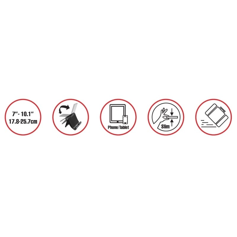 Stojánek pro tablety 7-10,1"/17-26cm v horizontální i vertikální poloze na stůl, lze i pro mobily a eBooky, plynule nastavitelný sklon až 225°, výklopný mechanizmus, robustní konstrukce z plastu, lehký a skladný pro transport, opření u na spodní hraně, rozměry 102 x 83.5 x 23 mm, barva černá..
