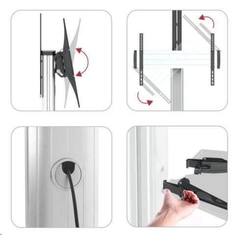 Stojan na Tv a monitory Fiber Mounts M80C1 Stojan na obrazovky 32-70", výškové nastavenie, náklon, pivot, police, pojezd Kvalitný stojan na uchytenie ako televízorov tak aj monitorov s uhlopriečkou 32-70" a hmotnosťou až 50kg. Stojan je plne nastaviteľný - výškovo, náklon obrazovky, funkcia pivot (otočenie obrazovky z horizontálnej do vertikálnej polohy), pojazdný s aretáciou. Konštrukcia stojanu má systém pre vedenie káblov. Televízne stojany Fiber Mounts M80C1 dodávame vrátane police na príslušenstvo (nosnosť 5kg) a hornej police (nosnosť 5kg) - obe police sú odnímateľné. Vďaka veľmi peknému dizajnu a výbornej cene sa stojan stal veľmi obľúbeným ako pre komerčné účely (hotely, firmy, prezentácie, výstavy, showroomy, kancelárie, konferencie), tak aj pre domácnosti (obývacie izby, spálne, detské izby, pracovne). Veľmi kvalitný a tiež pekný stojan na televízie aj monitory 32-70", výškové nastavenie, náklon, pojezd, pivot, police - stojan tv Fiber Mounts M80C1 Technické údaje: nosnosť 50kg stojan podporuje VESA štandardy 200x200 až 600x400 ideálny na Tv a monitory s uhlopriečkou 37-70" nastaviteľná výška 1200mm až 1600mm (výška od podlahy po stred televízora) funkcia PIVOT: možnosť pretáčania obrazovky z horizontálnej do vertikálnej polohy možnosť náklonu obrazovky +5° až -12° súčasťou balenia polička na príslušenstvo: rozmery 430x335mm, nosnosť 5kg súčasťou balenia polička na kameru alebo projektor: rozmery 285x150mm, nosnosť 5kg obe police sú výškovo nastaviteľné a odnímateľné konštrukcia prispôsobená pre možnosť skrytého vedenia káblov stabilná a bezpečná podstava s rozmermi 800x687mm pojezdové kolieska s brzdou na zaistenie konštrukcia z hliníka profesionálna kvalita farebné prevedenie strieborné, podstava čierna záruka 3 roky Televízny stojan výbornej kvality a krásneho dizajnu pre výstavy, konferencie, prednášky, firemné účely, hotely, ale aj do obývacích izieb namiesto televízneho stolíka - stojan Fiber Mounts M80C1 Profesionálny stojan na Tv a monitory Fiber Mounts M80C1 podporuje VESA štandardy pre uchytenie Tv a monitorov: VESA 200x200 VESA 300x200 a 200x300 VESA 300x300 VESA 400x200 a 200x400 VESA 400x300 a 300x400 VESA 400x400 VESA 600x400