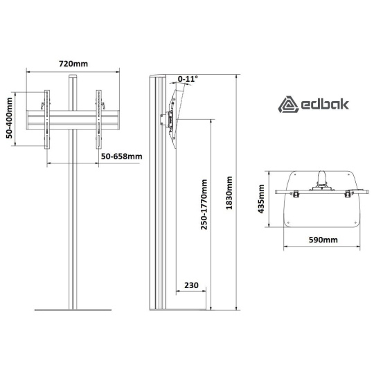 Profesionálny TV stojan Edbak STDV100 Stojan na TV a monitory 40-75", nastaviteľná výška obrazovky 250-1770mm, náklon 0°/-11°, vedenie káblov, VESA 75x75 až 600x400, nosnosť 80kg, Profesionálny dizajnový stojan na zavesenie televízorov, monitorov a dotykových obrazoviek s uhlopriečkou 40" až 75". Stojan je vyrobený z hliníka, podstava je z liatiny o rozmeroch 590x435x10mm. Podstavu je potrebné ukotviť do podlahy alebo pripraveného podstavca - nie je samostatne stojaci. Obrazovky je na stojane možné nastaviť do požadovanej výšky od 250mm až do 1770mm (vzdialenosť od podlahy po stred obrazovky) a nastaviť náklon od 0° až do -11°. Stojan je možné zakúpiť vrátane polici na príslušenstvo a police na kameru. Stojan podporuje VESA štandardy 75x75 až 600x400 a má nosnosť 80kg. Materiál hliník a liatina. Police sú kovové. Inštalačný materiál. Záruka 5 rokov. Profesionálny dizajnový podlahový stojan na televízory, monitory a dotykové obrazovky Edbak STDV100 Technické údaje: nosnosť 80kg podporuje VESA štandardy 75x75 až 600x400 na televízory, monitory a dotykové obrazovky 40" až 75" celková výška stojanu 1830mm nastaviteľná výška obrazovky 250-1770mm (od podlahy po stred obrazovky) nastaviteľný náklon obrazovky 0° až -11° podstava s otvormi na ukotvenie do podlahy rozmery podstavy 590x435x10mm možnosť zakúpenia aj s polici na príslušenstvo 400x300mm, nosnosť 10kg možnosť zakúpenia aj s polici na kameru 250x200mm, nosnosť 10kg materiál hliník a liatina profesionálny výrobok najvyššej kvality farebné prevedenie čierne záruka 5 rokov Detaily TV stojanu Edbak STDV100 TV stojany Edbak STDV100 podporujú VESA štandardy: VESA 75x75 VESA 100x100 VESA 200x100 a 100x200 VESA 200x200 VESA 300x200 a 200x300 VESA 300x300 VESA 400x200 a 200x400 VESA 400x300 a 300x400 VESA 400x400 VESA 600x400 Stojan je možné zakúpiť vrátane polici na príslušenstvo a police na kameru. Police sú kovové a majú nosnosť 10kg.