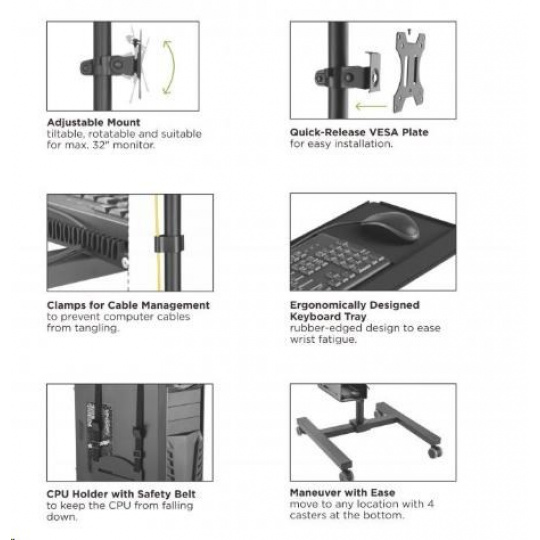 Pojazdný stojan na PC monitor a klávesnicu Fiber Mounts AX793 Profesionálne riešenie pre Vaše mobilné PC pracovisko - mobilný stojan na PC Potrebujete si vytvoriť pojazdné PC pracovisko za čo najlepšiu cenu? Máme pre Vás kompletné riešenie za bezkonkurenčnú cenu - pojazdný stojan s držiakom na PC, držiakom na monitor a policou na klávesnicu. Všetko je pritom ergonomické - nastaviteľná výška, náklon a natočenie monitoru, nastaviteľná výška klávesnice a myši, výškové nastavenie držiaku PC, pojazdové kolieska s aretáciou. Farebné prevedenie čierne, záruka 3 roky. Stojan na PC s držiakom monitoru a policou na klávesnicu a myš - mobilná pojazdná PC pracovňa - Fiber Mounts AX793 Technické údaje: držiak na PC s výškovým polohovaním, nosnosť 8kg polica na klávesnicu a myš s výškovým polohovaním, nosnosť 2kg držiak na monitor 17" až 32" s výškovým polohovaním, nosnosť 10kg držiak monitora podporuje VESA 75x75 a 100x100 / možnosť rozšírenia až na 200x200 otáčanie monitora do strán +/- 180° náklon monitora +/- 15° rotácia monitora +/- 180° celková nosnosť stojanu 20kg pojazdové kolieska s brzdou systém vedenia káblov výborná kvalita farebné prevedenie čierne záruka 3 roky Profesionálna PC pracovňa, pojazdná / mobilná - Fiber Mounts AX793 Stojan na PC, monitor a klávesnicu s myšou AX793 podporuje VESA štandardy pre uchytenie monitorov: VESA 75x75 VESA 100x100 v prípade potreby možnosť zakúpenia rozšírenia na VESA 200x100 v prípade potreby možnosť zakúpenia rozšírenia na VESA 200x200