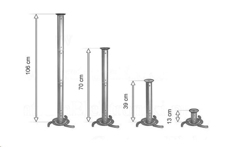 Kompletná špecifikácia Stropný držiak projektora Fiber Mounts M5C17 Dĺžkovo nastaviteľný, otočný, sklopný držiak projektora na strop, strieborný, nosnosť 10kg, univerzálny na všetky bežne dostupné projektory Stropný držiak projektora s nastaviteľnými vzdialenosťami od stropu Fiber Mounts M5C17 Univerzálny, kvalitný polohovací držiak na stropné zavedenie projektorov a dataprojektorov. Držiak je vhodný na 99% všetkých dostupných projektorov. Súčasťou balenia sú dĺžkové nástavce, vďaka ktorým je projektor možné zavesiť od stropu v dĺžke od 13 až do 106cm, nakloniť o 15° a otáčať do strán. Držiak je vyrobený z hliníku. Farebné prevedenie strieborné. Držiak pre stropné upevnenie projektora Fiber Mounts M5C17 Technické údaje: nosnosť 10kg univerzálny, vhodný na 99% bežne dostupných projektorov náklon +/- 15° natočenie do stan +/- 360° nastaviteľná dĺžka od stropu 13, 39, 70 alebo 106cm farba strieborná hliníková konštrukcia záruka 2 roky