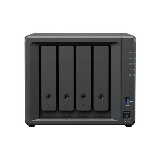 | Obsah balenia | • 1 x hlavná jednotka DP340 • 4 x 3,5" SATA HDD • 1 x adaptér • 1 x napájací kábel • 2 x sieťový kábel RJ-45 • 1 x súprava s príslušenstvom • 1 x stručná inštalačná príručka |