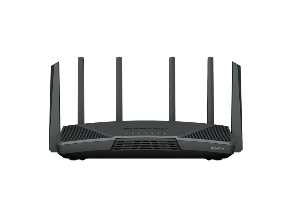 trojpásmový router RT6600ax je založený na novom štandarde Wi-Fi 6 a ponúka prenosovú rýchlosť až 6,6 Gb/s v kombinovanej bezdrôtovej prevádzke. Jeho tri rádiá pracujú v spojení s konfigurovateľným 2,5GbE WAN/LAN portom, aby sa zabezpečila maximálna rýchlosť pripojenia pre jednotlivé zariadenia. Zariadenie RT6600ax je poháňané naším neustále sa vyvíjajúcim operačným systémom Synology Router Manager a je navrhnuté tak, aby zjednodušilo zabezpečenie a správu siete.