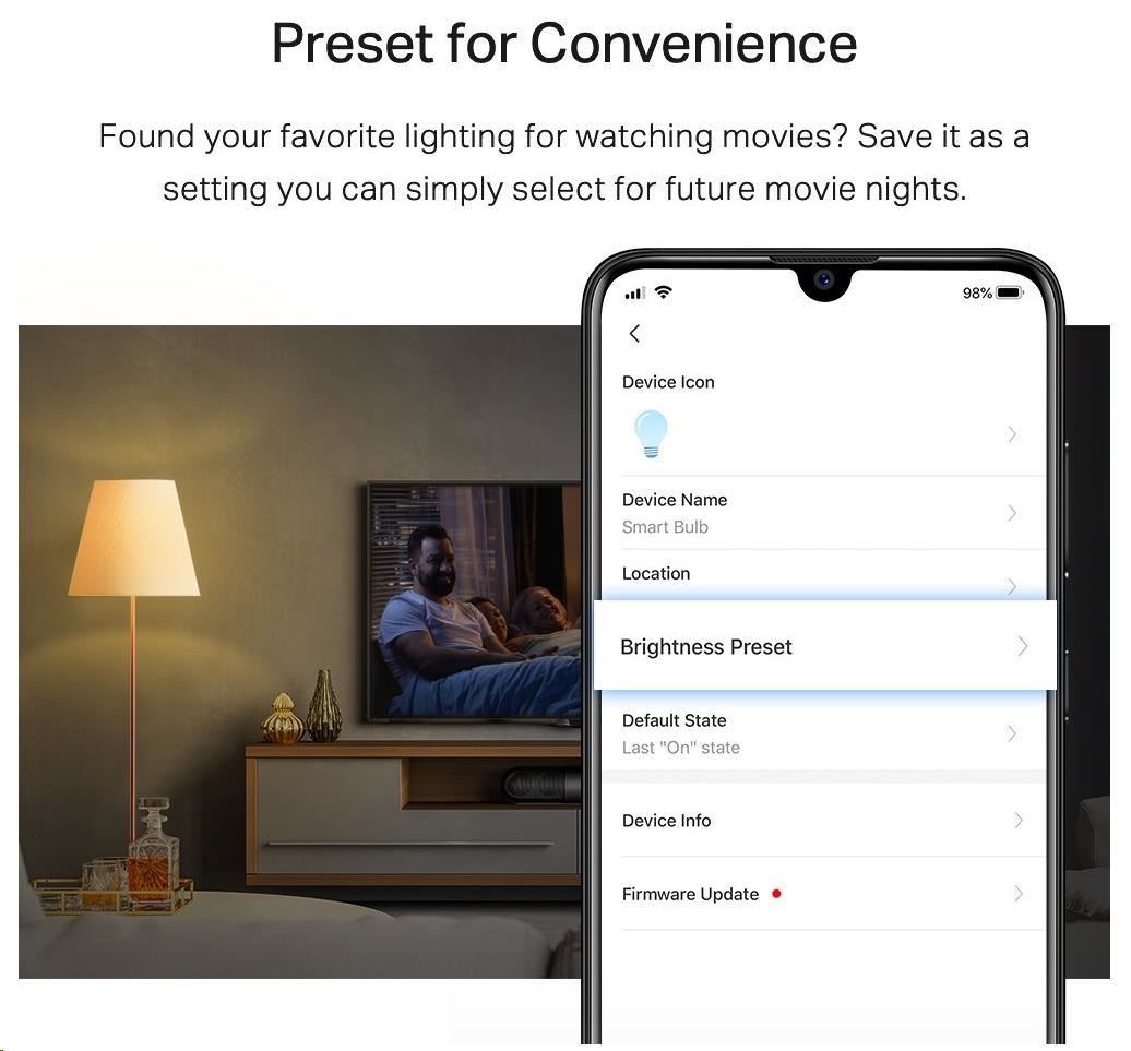 - Stmievanie (nastavenie pre vaše pohodlie) – Našli ste svoje obľúbené osvetlenie na sledovanie filmov? Uložte si ho ako nastavenie, ktoré si môžete jednoducho vybrať pre budúce filmové noci.