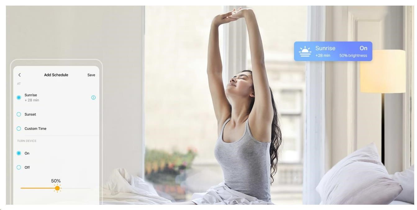 - Časový plán (nastavte si časy) – Vytvorte si pravidelný plán na zapnutie/vypnutie s nastaviteľnou jasom.