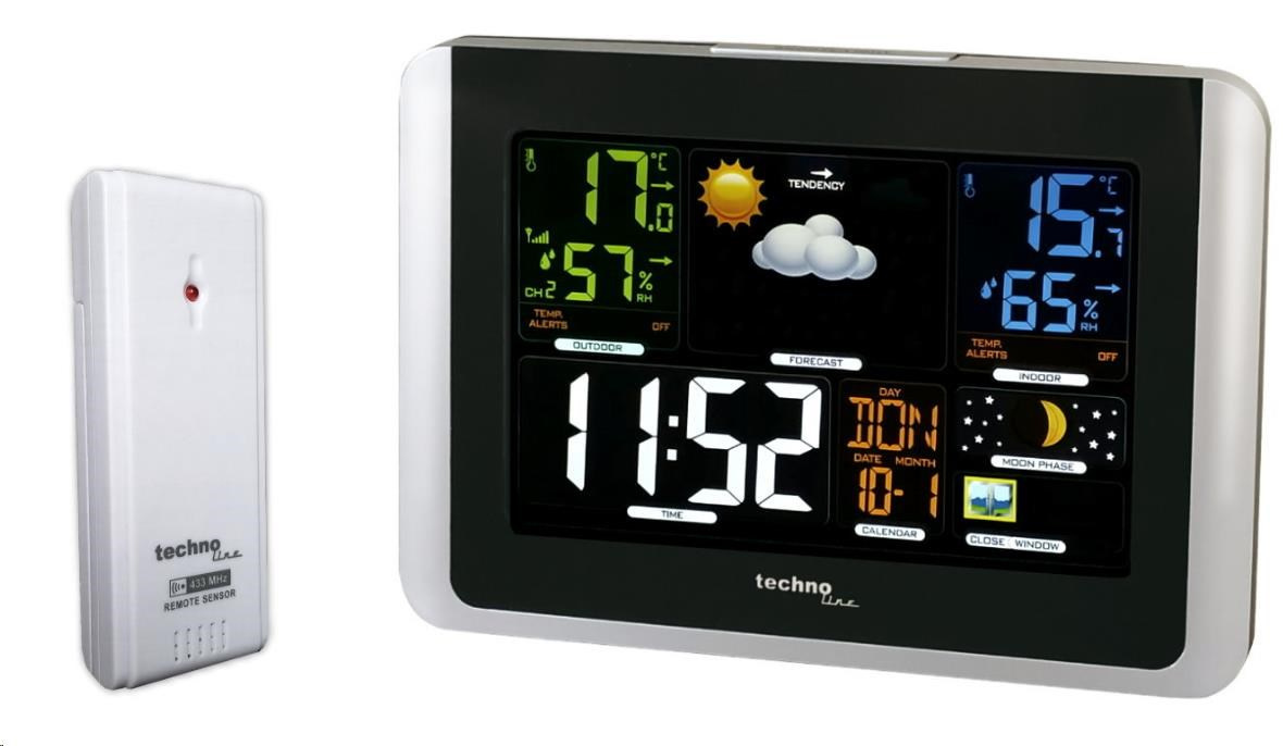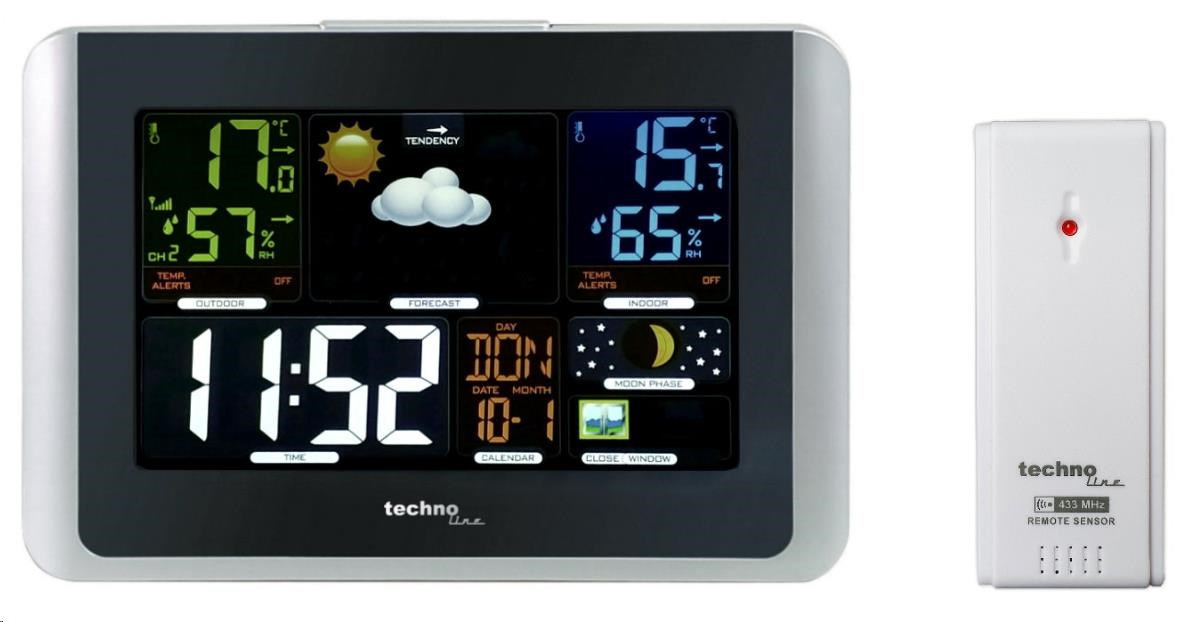 Meteorologická stanica s inverzným farebným LED displejom - farebný inverzný LED displej 127 x 79 mm, stále osvetlený pri napájaní sieťovým adaptérom, 2 stupne jasu, možnosť vypnutia, pri napájaní batériami možnosť osvetlenia displeja na 10 s - farby displeja: čas biela, dátum oranžová, vnútorná teplota a relatívna vlhkosť modrá, vonkajšia teplota a relatívna vlhkosť zelená - veľkosť číslic: čas 25,5 mm, skrátený názov dňa, dátum 10 mm, teplota 15,5 mm, rel. vlhkosť 11,5 mm - čas riadený rádiovým signálom DCF-77 - možnosť manuálneho nastavenia času - 12- alebo 24-hodinový formát zobrazenia času - možnosť nastavenia časovej zóny od -12 do +12 hodín - dátum, skratka názvu dňa (EN, FR, GE, SP, IT, NL, DK) - budík s funkciou opakovaného budenia (Snooze) po 10 minútach - budenie zvukovým signálom (10 sekúnd 1 pípnutie za sekundu, 10 sekúnd 2 pípnutia za sekundu, potom stále 4 pípnutia za sekundu) - 6 animovaných ikon predpovede počasia (jasno, polojasno, zamračené, dážď, búrky, snehové prehánky) - zobrazenie hodnôt vnútorné a vonkajšej teploty a relatívnej vlhkosti - možnosť zobrazenia teploty vo F alebo ve C - pamäť na max. a min. namerané hodnoty teploty a relatívnej vlhkosti (automaticky sa maže o 0:00) - šípky tendencie vývoja barometrického tlaku, vnútorné teploty a relatívnej vlhkosti - alarm horná a dolná hranica vonkajšej teploty na každom kanáli v rozsahu od -40 °C do +60 °C zvukovým signálom - alarm horná a dolná hranica vnútorné teploty v rozsahu od 0 °C do +50 °C zvukovým signálom - ikona nutnosti zatvorenia alebo otvorenia okna na základe nameraných vnútorných teplôt a relatívnej vlhkosti - možnosť zobrazenia vonkajšieho rosného bodu a teplotného indexu - fáza Mesiaca - možnosť pripojenia až 3 bezdrôtových senzorov mode- mode- TX960-TH, jeden bezdrôtový senzor je súčasťou balenia - možnosť automatického prepínania kanálov po 30 s - bezdrôtový prenos hodnôt vonkajšej teploty na frekvencii 433 MHz - dosah až 100 m v otvorenom priestore - indikácia slabých batérií - farba hlavnej jednotky čierna so strieborným rámikom - rozmery hlavnej časti 174 x 119 x 29 mm - napájanie sieťovým adaptérom alebo batériami - možnosť postavenia alebo zavesenia Bezdrôtové čidlo TX960-TH - vodeodolné prevedenie - dosah signálu bezdrôtového čidla až 100 m v otvorenom priestore - meranie teploty a relatívnej vlhkosti - indikácia vysielania LED diódou - možnosť postavenia a zavesenia - farba biela - rozmery 39 x 99 x 24 mm - napájanie 3 ks batérií 1,5 V typ AAA (mikrotužkové) Obsah balenia - hlavná jednotka WS 6442 - bezdrôtové čidlo TX960-TH - sieťový adaptér 5 V, 150 mA - návod CZ, EN, PL, GE, FR, ES, IT, NL