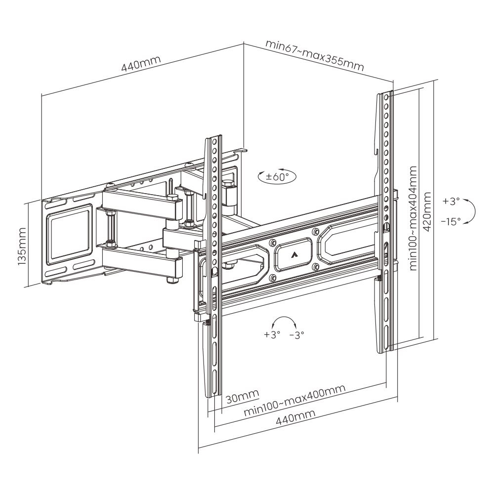Televízny držiak Fiber Mounts FM79 Držiak na TV 30-70", VESA 100x100 až 400x400, otáčanie do strán +/-60°, naklápanie +3°/-15°, korekcia roviny +/-3°, vzdialenosť TV od steny 67-355mm, pevná a spoľahlivá konštrukcia s nosnosťou 40kg Televízny držiak Fiber Mounts FM79 Technické údaje: nosnosť 40kg podporuje VESA štandardy 100x100 až 400x400 odporúčame na televízie s uhlopriečkou 30" až 70" nastaviteľná vzdialenosť televízie od steny 67-355mm otáčanie do strán až +/- 60° naklápanie TV od +3° / -12° korekcia roviny obrazovky +/- 3° montážna plocha na stenu 440x135mm oceľová konštrukcia s vysokou pevnosťou úchytky na káble farebné prevedenie čierne záručná doba 5 rokov Televízny držiak Fiber Mounts FM79 podporuje VESA štandardy: VESA 100x100 VESA 150x150 VESA 200x100 a 100x200 VESA 200x200 VESA 300x200 a 200x300 VESA 300x300 VESA 400x200 a 200x400 VESA 400x300 a 300x400 VESA 400x400 Na držiaky Fiber Mounts FM79 je možné zavesiť akékoľvek televízie, ktorých hmotnosť nie je vyššia ako 40kg a ktoré podporujú niektorý z uvedených VESA štandardov. Uvádzaná veľkosť / uhlopriečka televízie nie je podstatná a neurčuje, či je TV na držiaku vhodná.