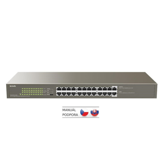 Tenda TEG1124P-24-250W prenáša dáta pomocou 24 portov RJ45, 24 portov 10/100/1000 Mb/s podporuje PoE802.3af/at. Switch má ochranu proti prepätiu 6kV. Podpora prepojovania uzlov v móde Store-and-Forward. Full-duplex kontrola toku 802.3x, half-duplex kontrola toku v režime Back-Pressure.