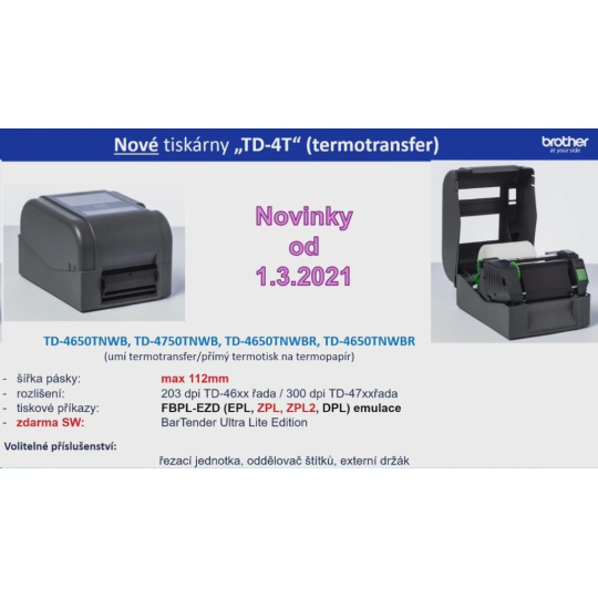 Tlačiareň štítkov BROTHER TD-4750TNWBR (tlač štítkov, 300 dpi, max. šírka štítku 112 mm) USB,LAN,WiFi,Bluetooth,RS-232C+RFID
