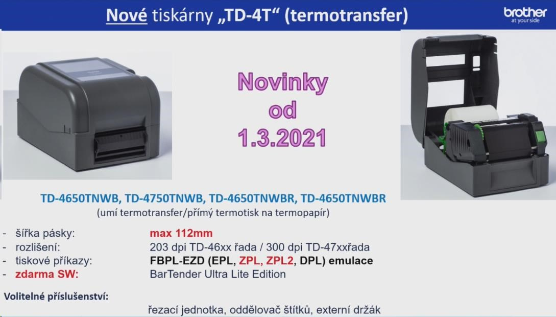 Tlačiareň štítkov BROTHER TD-4750TNWBR (tlač štítkov, 300 dpi, max. šírka štítku 112 mm) USB,LAN,WiFi,Bluetooth,RS-232C+RFID