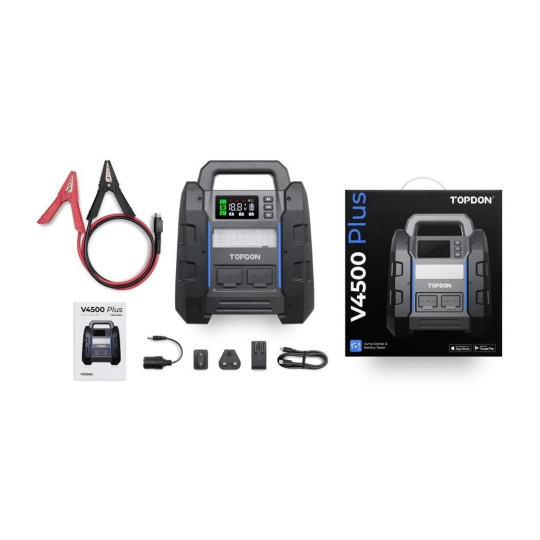 12 V štartér TOPDON V4500 Plus je určený špeciálne pre profesionálne vozidlá a vozidlá s vysokým výkonom. Chváli sa špičkovým prúdom až 4500 A a počas niekoľkých sekúnd rýchlo oživí najrôznejšie vozidlá - od návesov a prívesov až po terénne vozidlá a lode. Navyše s kapacitou až 45 štartov na jedno nabitie budete vždy pripravení na cestu s istotou.