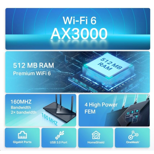 | Dosah WiFi | Domáce priestory 3 izbové 4× pevné vysokovýkonné antény Viaceré antény tvoria signálové pole na pokrytie viacerých smerov a veľkých plôch Beamforming Zameriava bezdrôtový signál na klientov pre rozšírenie dosahu WiFi Vysokovýkonná FEM Zlepšuje výkon vysielania na posilnenie signálovej pokrytia |