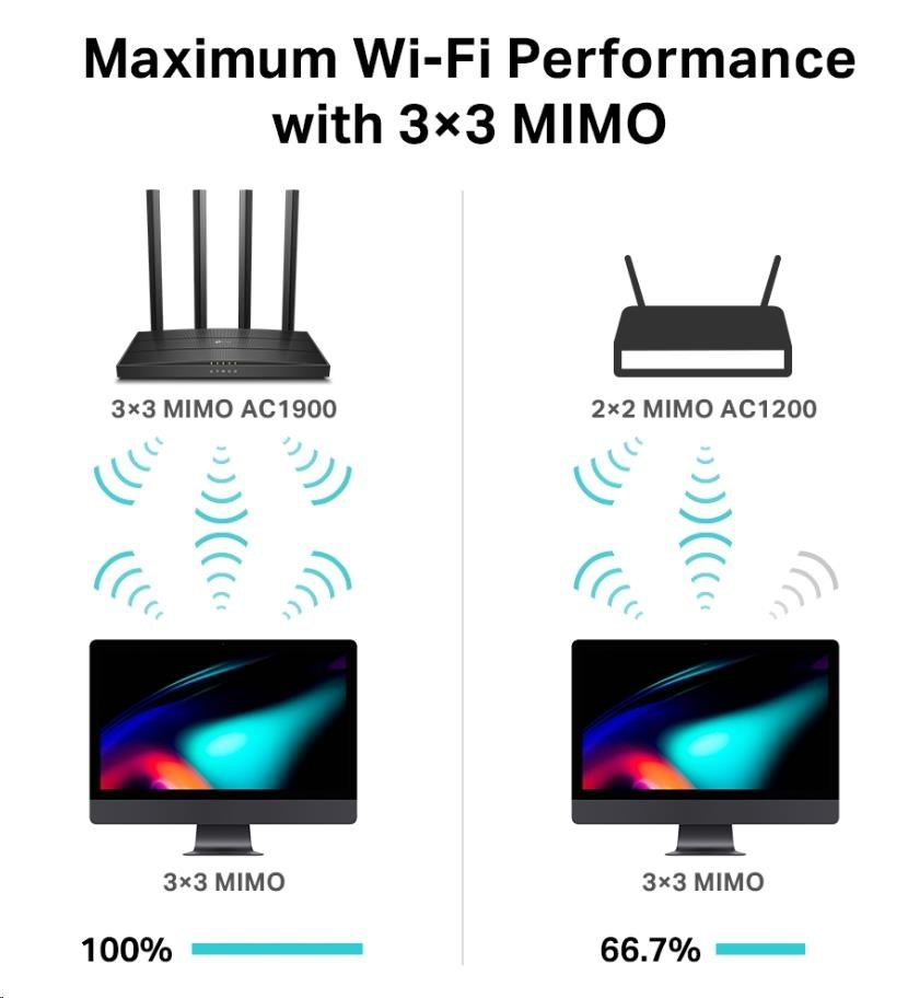 • 3×3 MIMO technológia – Prenos a príjem dát vo troch prúdoch pre bezproblémové spárovanie s vašimi 3 × 3 klientmi.