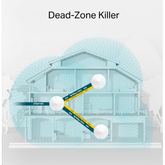| Dohľad WiFi | Domy na 3-5 izbových (3-pack) TP-Link Mesh technológia Voliteľná Ethernetová spätná väzba spolupracuje na prepojení jednotiek Deco pre bezproblémové pokrytie 4× antény (vnútorné) Viacnásobné antény tvoria zosilňujúce pole, ktoré pokrýva viac smerov a veľké plochy Beamforming Zameriava bezdrôtový signál na klientov, aby rozšíril dosah WiFi |