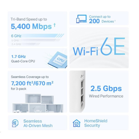 - Wi-Fi 6E pokrytie celej domácnosti – pokryte plochu až 500 m2 ničím nerušeným Wi-Fi signálom budúcej generácie a zabudnite na mŕtve zóny pokrytia a načítanie do vyrovnávacej pamäte