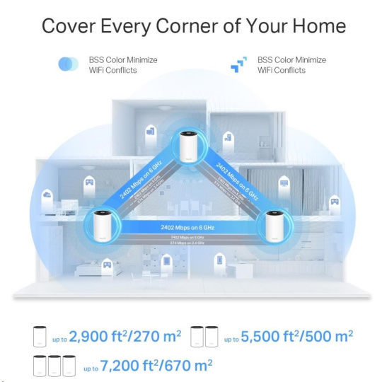 | WiFi Dosah | 4-7+ Bedroom Houses (3-sada) Tecnológia TP-Link Mesh Voliteľné Ethernet backhaul spolupracuje na prepojení jednotiek Deco pre plynulé pokrytie AI-Driven Mesh Vyhodnocuje prostredie siete, aby zabezpečil ideálne Wi-Fi špecifické pre váš domov 4× vysoko ziskové antény (vnútorné) Mnohoanténové pole na zosilnenie signálu na väčšie smery a veľké oblasti Tri-pásmové Novým otvorením pásma 6 GHz prináša viac šírky pásma a rýchlejšie rýchlosti Beamforming Sústreďuje bezdrôtovú silu signálu na klientov a rozšíri WiFi dosah |