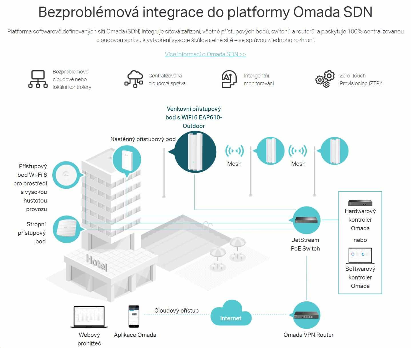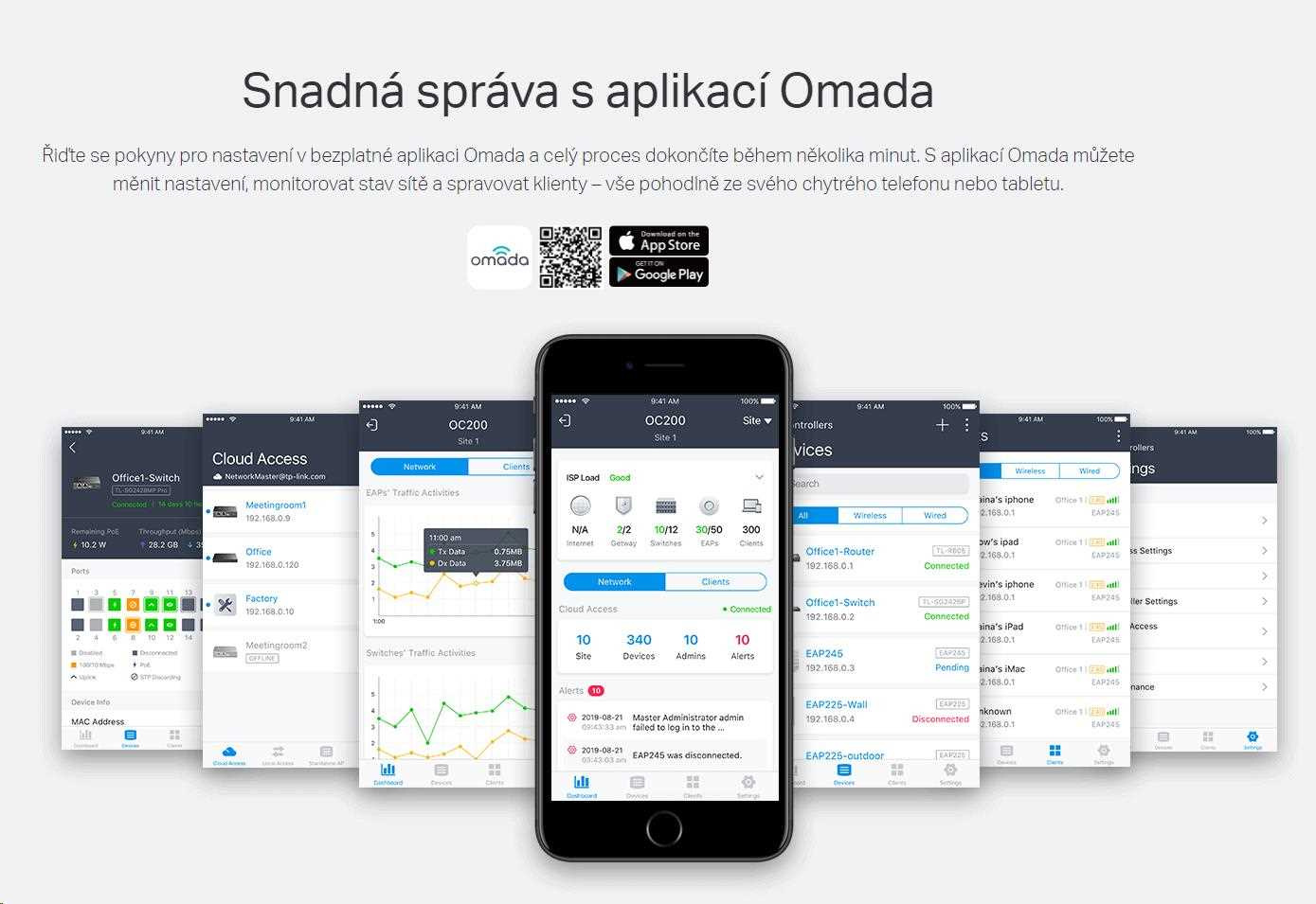 - Centralizovaná cloudová správa: Integrácia s platformou Omada SDN umožňuje cloudový prístup a vzdialenú správu.