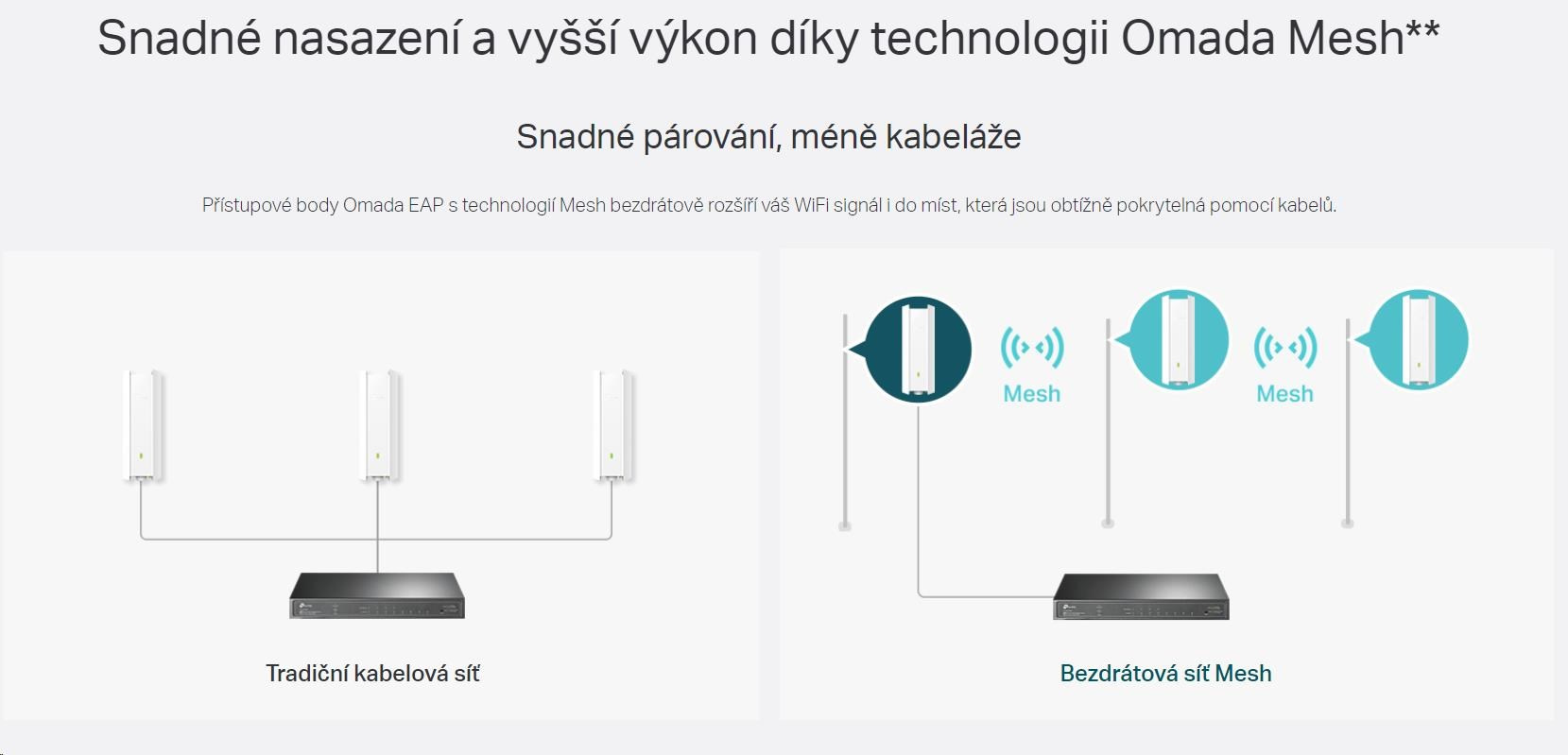 - Technológia Omada Mesh: Umožňuje bezdrôtové spojenie medzi prístupovými bodmi na získanie rozšíreného dosahu a flexibilného nasadenia.