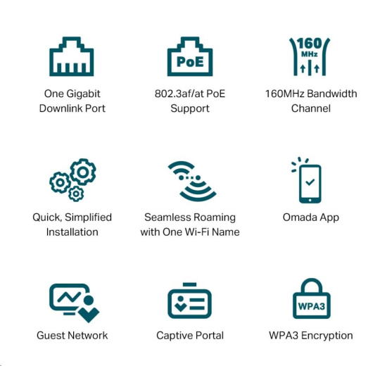 | Bezdrôtová bezpečnosť | • Captive Portal Authentication • Access Control • Filtrovanie MAC adries bezdrôtovo • Izolácia klientov • VLAN • Detekcia Rogue AP • Podpora 802.1X • WPA-Personal/Enterprise, WPA2-Personal/Enterprise, WPA3-Personal/Enterprise |