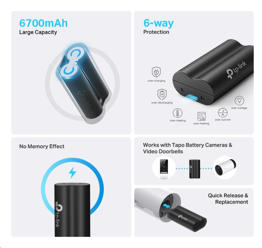 - 6700mAh Veľká kapacita – Predlžuje dobu používania (až 180 dní) vašich kamier Tapo napájaných batériou a videozvonov.