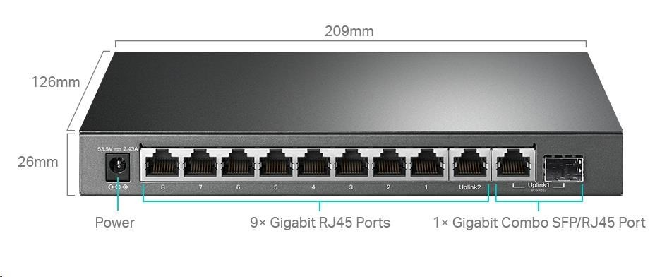 | Rozhranie | 9× 10/100/1000 Mbps RJ45 portov 1× 1000 Mbps Combo SFP/RJ45 port AUTOMATICKÉ dohadovanie/negotnácia MDI/MDIX |