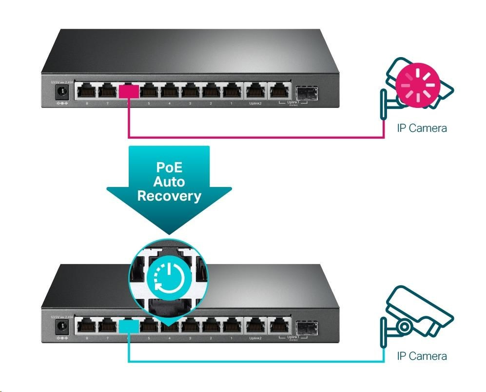 TP-Link CCTV Easy Smart switch TL-SG1210MPE (8xGbE, 1xGbE uplink, 1xGbE/SFP combo uplink, 8xPoE+, 123W, fanless)