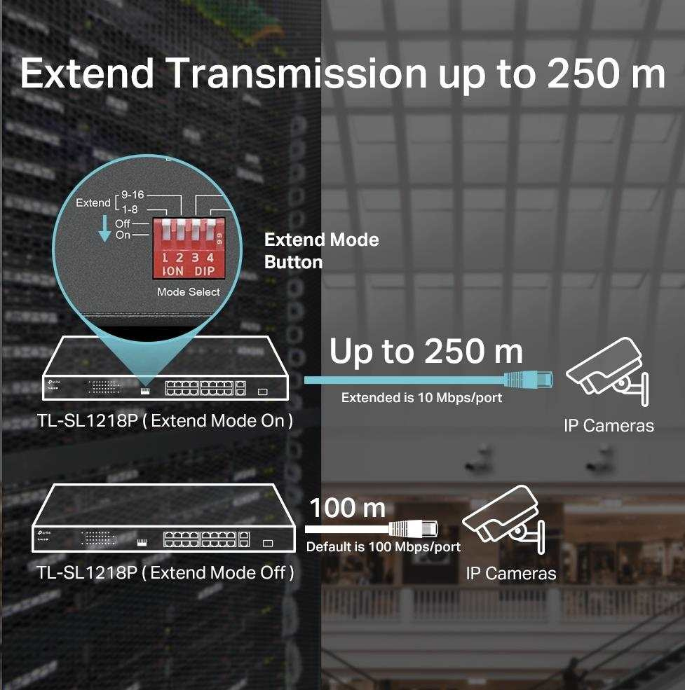 - Prenos dát a napájania až do vzdialenosti 250 m v režime predĺženia špeciálne navrhnutého pre dohľadový systém.