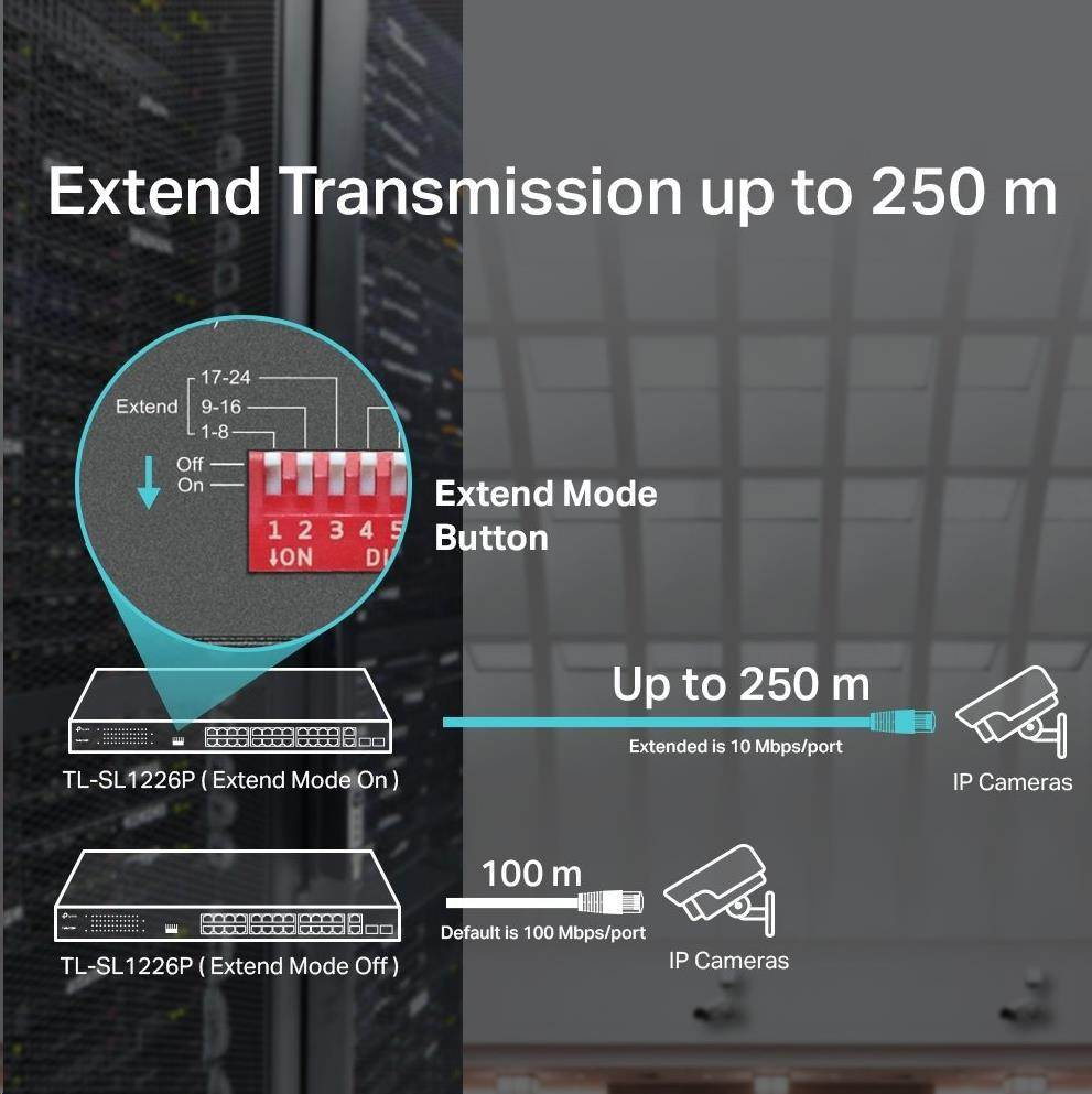 - Prenos dát a PoE napájanie až do vzdialenosti 250 m v režime predĺženia, špeciálne navrhnutého pre dohľadový systém