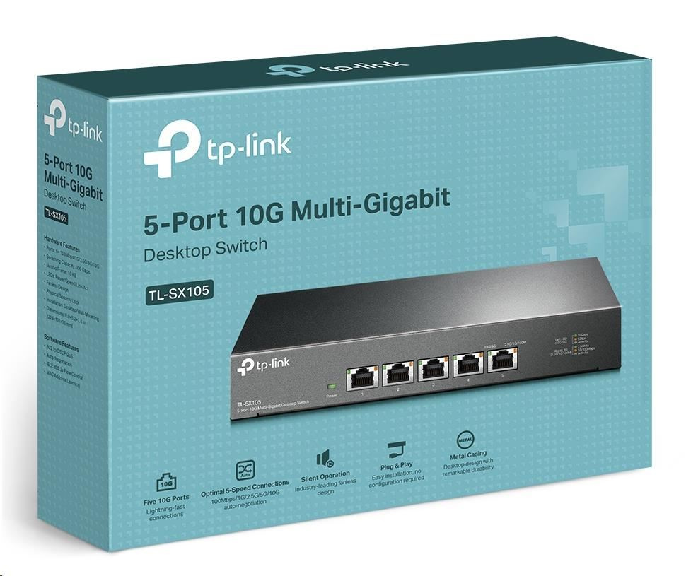 Switch TL-SX105, ktorý je vlajkovým produktom segmentu 10G, je 5portový stolový prepínač 10G s kapacitou prepínania až 100 Gbit/s. Funkcia automatického vyjednávania rýchlostí 5rýchlostného pripojenia (100 Mbit/s / 1G / 2.5G / 5G / 10G) monitoruje rýchlosť pripojenia a inteligentne ju prispôsobuje pre kompatibilitu a optimálny výkon všetkých vašich zariadení, vrátane NAS 10G, 10G serverov, pracovných staníc, herných počítačov, prístupových bodov 2.5G / 5G / 10G WiFi 6, 8K videí, stolových počítačov a ďalších aplikácií.
