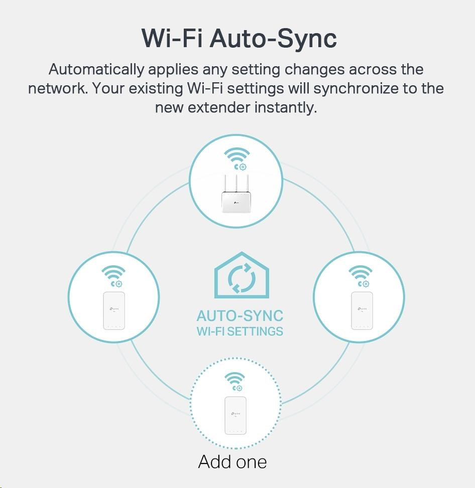 - Automatická synchronizácia Wi-Fi – jednoducho skopírujte nastavenia Wi-Fi siete routra a použite všetky zmeny v celej zabezpečenej sieti Powerline s funkciami klonovania a presunu Wi-Fi.