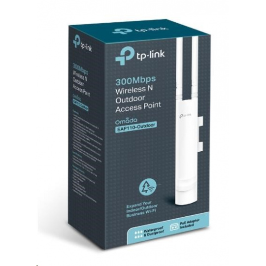 | Obsah balenia | • 300 Mbps Wireless N Vonkajší Access point, EAP110-Outdoor • Pasívny PoE adaptér • Napájací kábel • Montážne sady • Vodotesný gumový vložka • Vodotesné antény • Inštruktážny návod |