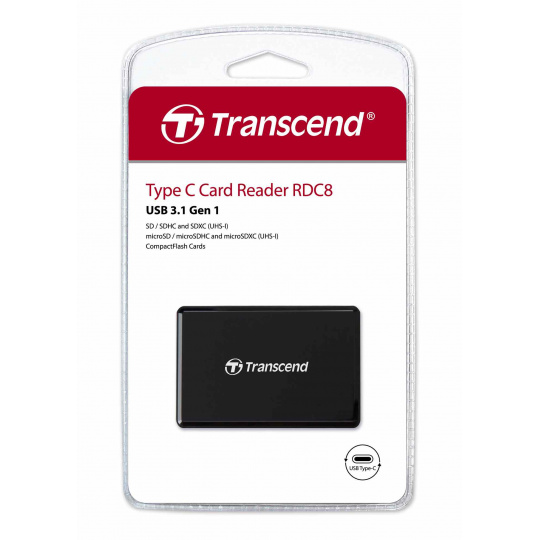 Čítačka kariet RDC8 od spoločnosti Transcend so štyrmi slotmi je určená pre nové počítačové platformy s portom USB typu C, ako sú 12-palcový MacBook od spoločnosti Apple a Chromebook Pixel 2 od spoločnosti Google, a dokáže naplno využiť potenciál väčšiny flash kariet vrátane kariet SD, microSD, CF a Memory Stick (MS). Vybavený USB 3.1 Gen 1, Transcend RDC8 je ideálnou voľbou pre rýchly a efektívny prenos dát z flash karty do notebooku s portami USB typu C.