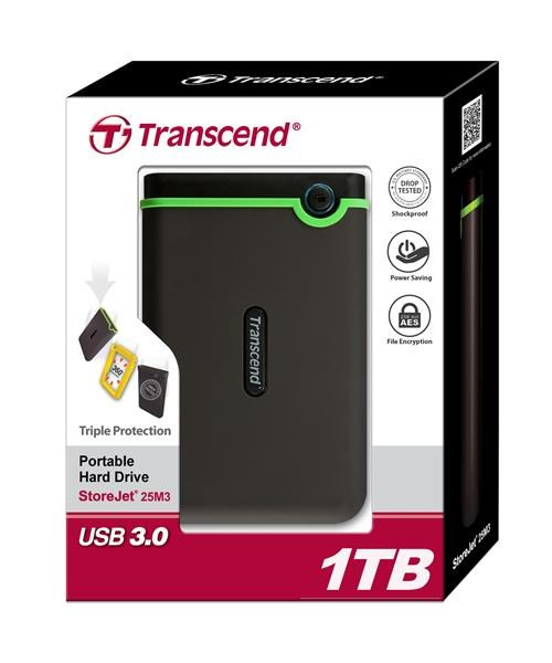 Externý pevný disk TRANSCEND 2,5" USB 3.1 StoreJet 25M3S, 1 TB, čierna (SATA, gumené puzdro, proti nárazom)