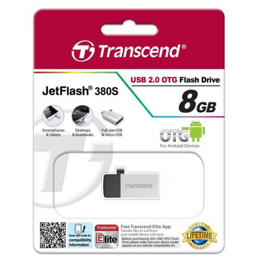 TRANSCEND Flash disk 8GB JetFlash®380S, USB 2.0/micro USB (R:20/W:5 MB/s) strieborná