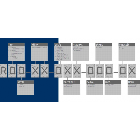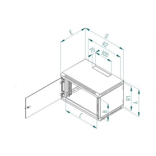 Presné rozmery a ďalšie technické údaje sú uvedené nižšie (hodnoty R1 a R2 označujú vzdialenosť montážnych otvorov na zavesenie rozvádzača na stenu). - Maximálne zaťaženie skrinky je 30 kg.