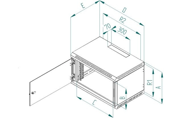 Rozvádzač Delta B je celozváraný nástenný jednodielny rozvádzač s celosklenenými dverami, ktoré sa vďaka masívnym závesom dajú otvoriť v uhle takmer 180°. Dôležitou súčasťou výrobku sú otvory na káble, ktoré sa nachádzajú na hornej a dolnej stene. Ďalšie dva otvory sa nachádzajú na zadnej stene rozvádzača. Otvory sú utesnené vylamovacími zátkami, ktoré sa dajú vylomiť napr. skrutkovač. 19" zariadenia sú nainštalované na vertikálnych koľajniciach, ktoré sa dajú plynule prispôsobiť hĺbke tela skrine. Perforácia zabezpečuje prirodzenú cirkuláciu vzduchu a chladenie komponentov. Presné rozmery a ďalšie technické údaje sú uvedené nižšie (hodnoty R1 a R2 označujú vzdialenosť montážnych otvorov na zavesenie rozvádzača na stenu). Maximálne zaťaženie skrinky je 30 kg. Rozmery: A - 500 mm B - 395 mm C - 490 mm D - 600 mm E - 395 mm R1 - 454 mm R2 - 420 mm Hmotnosť - 17,4 kg Balenie: Kľúč - predné dvierka 2x Skrutka 6x50 4x Podložka 6,6 4x Hmoždinka 10 4x Plastová podložka 8x Plávajúca matica M6 8x Skrutka M6x16 8x Prachová krytka 1x..
