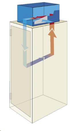 Vďaka tomuto usporiadaniu sa okolitý vzduch a vzduch cirkulujúci vo vnútri skrine nemiešajú, čím sa nezvyšuje vlhkosť vo vnútri skrine. Vlhkosť by mohla kondenzovať na povrchu nainštalovaného zariadenia a poškodiť ho alebo zamrznúť vo vnútri klimatizačného zariadenia, čo by mohlo spôsobiť jeho nefunkčnosť, ak by jednotka nebola správne nastavená. Preto je potrebné dbať na správne nastavenie jednotky s ohľadom na okolitú teplotu a vlhkosť. Na zníženie tohto rizika môže byť jednotka vybavená dverným kontaktom, ktorý automaticky vypne kompresor, keď sa otvoria dvere.