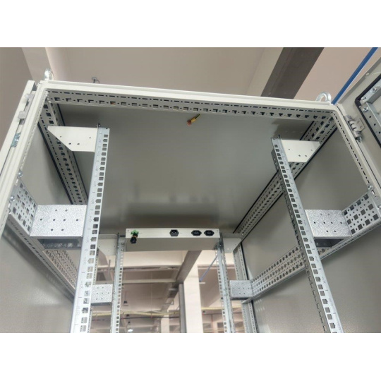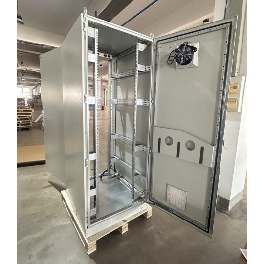 Rozvádzač na inštaláciu dátových a telekomunikačných zariadení, ventilácia s termostatom, podstavec, šedý.